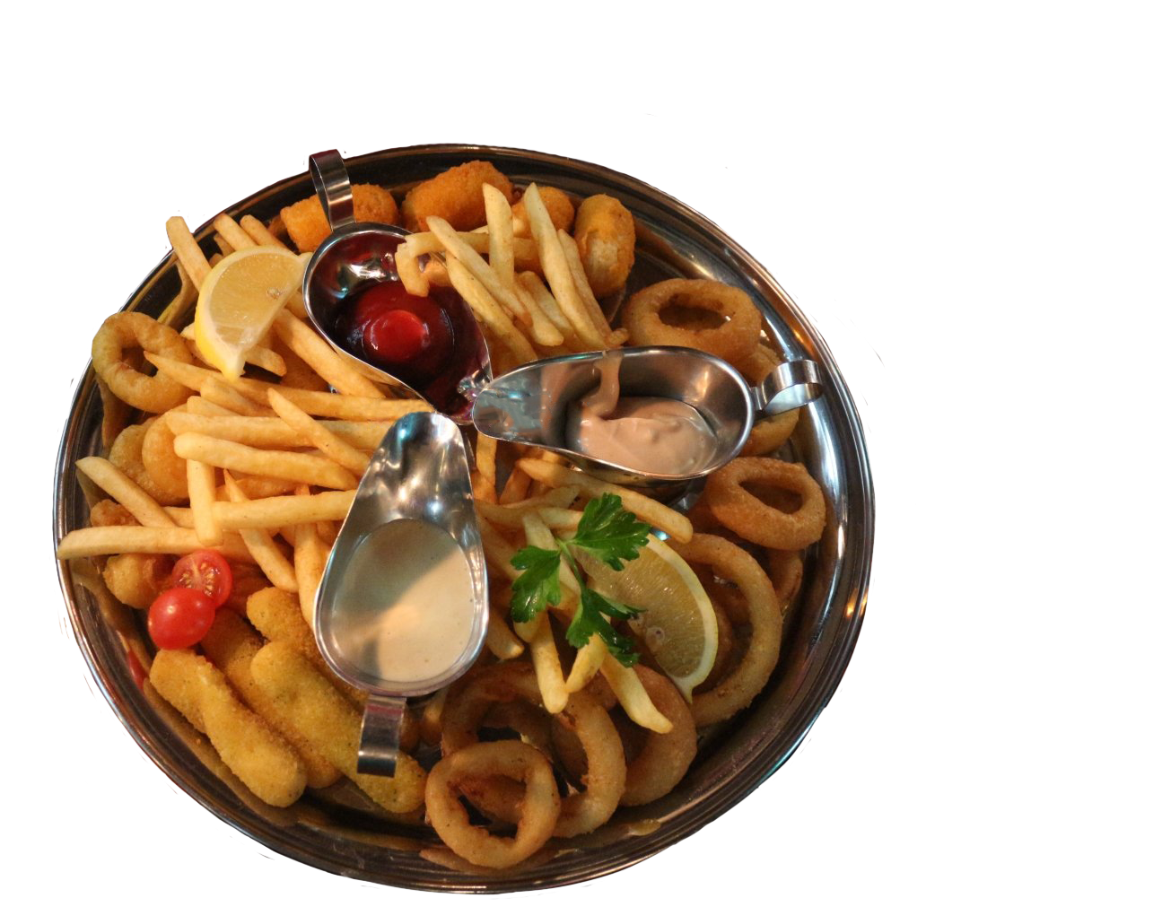 (chicken, tomato gherkin pickles, lettuce, french fries + special sauce)